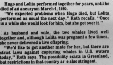 August 29, 2009: A recently discovered news article in the Boca Raton Newspaper from December 2, 1981, states that Lolita was pregnant several times when she was still with her now long gone mate Hugo.